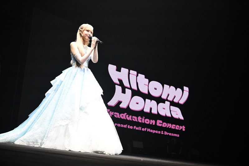 アンコールでは、本田が歩んだ10年間のアイドル人生を振り返る軌跡映像が流れ、きらきらと輝く水色と白の卒業ドレスに身を包んだ本人がステージに登場。同郷の先輩・大島優子のソロ曲である『泣きながら微笑んで』を歌い上げ、こみ上げる熱い想いを歌声にのせて届けた。卒業スピーチでは「私はAKB48に加入した10年前、AKB48 チーム8という新しい土壌に種を植えてもらいました。地元の栃木県から毎週新幹線で東京に通って、さまざまな活動を通して貴重な経験をさせていただき、すべてが学びの毎日でした。ですが、なかなか握手会の数が伸びなかったり、一緒に頑張ってきた同期のメンバーがどんどん選抜メンバーに選ばれるようになって、種から小さな芽を出したものの、その芽は伸びず、それでも応援してくださるファンのみなさんの期待に応えられない申し訳なさで自分に自信を失ってしまったこともありました。でもみなさんは、ずっと変わらず私を信じてくださり、温かい日差しになってくださり、応援という栄養を与え続けてくれました。みなさんが降り注いでくださったたくさんの栄養のおかげで、私はまた大きな一歩を踏み出すことができ、小さかった芽はつぼみをつけ、花を咲かせることができ、そして今日を迎えられたと思っています。辛くて悔しくてたくさんの涙で前が見えなかった日もあったけど、今日私の目にはきらきら輝く夢と希望の光で溢れています。こんなにも素敵な景色の中で、世界にたったひとつの美しいドレスをまとい、大好きな人たちに卒業を見送ってもらえる私は本当に世界一の幸せ者です。そして、ファンのみなさんとともに、未熟な私を見守ってくださり、たくさんの愛を注ぎ、育ててくださった秋元先生をはじめ、スタッフのみなさん・大切な家族やお友達・共演者の方々など、お世話になったすべての方々に感謝を伝えたいです。私は明後日の劇場公演をもってAKB48を卒業しますが、私のアイドルとしての原点がAKB48であることは、これからも一生変わることはありません。秋元先生が紡ぎ出す唯一無二の世界観で、メンバーたちとパフォーマンスができた誇りと思い出を胸に、また新たな道を歩んで行こうと思います。私にはまだ叶えたい夢があります。秋元先生からも“本田の人生なんだから好きなことをしなさい”と背中を押していただきました。卒業発表をして約半年間、今後についてたくさん悩み考えたのですが、今日のステージを通しても思ったんですけど、やっぱり私はこうして歌って踊って、こうしてみなさんからの応援を受けることに幸せを感じて、一番大好きなことなんだなって思いました。挑戦することは怖いことでもあるけど、ほんの少しの勇気で想像もできないほど美しくて広い世界がたくさん見られるということをみなさんが教えてくださいました。だから卒業後も、みなさんの力で咲かせてくださったこの花を枯れさせたくないです。そのために卒業後は、少しだけ充電期間とお休みをいただきたいと思っています。ですが充電後は、また新たな本田仁美をお見せすることを絶対に約束しますので、少しの間だけ待っていてくださると嬉しいです。今日までの10年間、どんなときも味方でいてくれて、私の夢と希望でいてくださって本当にありがとうございました!」と一言一言に力を込めて語った。また、海外のファンに向けて韓国語と中国語でも感謝を伝えた。
