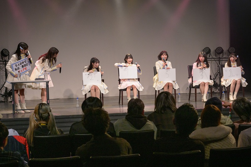 その後はこの日二つ目の企画コーナー。「5人の中で私は⚪︎番目にピュアだ」「5人の中で私は⚪︎番目にかわいい」などメンバーの中から5人にお題を与え、「自分は何番目か」を答えるコーナー。ワイワイ盛り上がるメンバーたちだった。