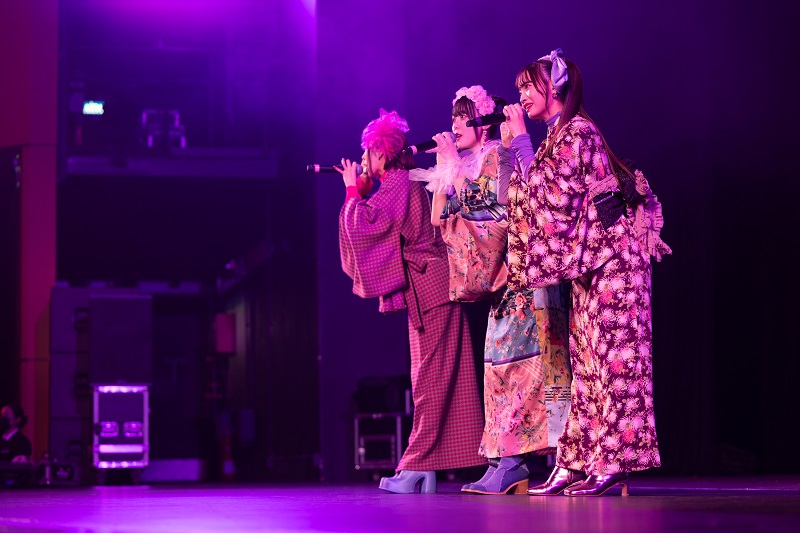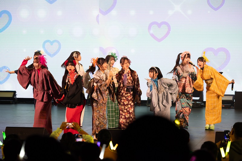 会場となったザ・ロンドナー・シアターで恒例のOvertureが流れてライブが始まると、10人のメンバーがまとう着物に1人ずつスポットが当たっていく― 10人それぞれ異なる模様でデザインもさまざま。靴やアクセサリーも十人十色の着物で披露する「初恋のひと。」「ユメムスビ」で、楽曲にも新しい印象を与え、日本文化をPRするスプリングフェスティバルにもぴったりの幕開きとなった。