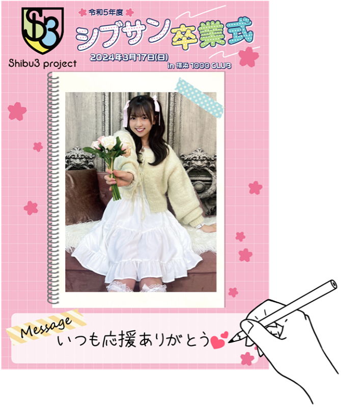 「Shibu3 project ONEMAN LIVE 令和5年度 シブサン卒業式」の特典会にて購入のグッズを持参するとその場でシブサンメンバーから直筆のメッセージが送られる。