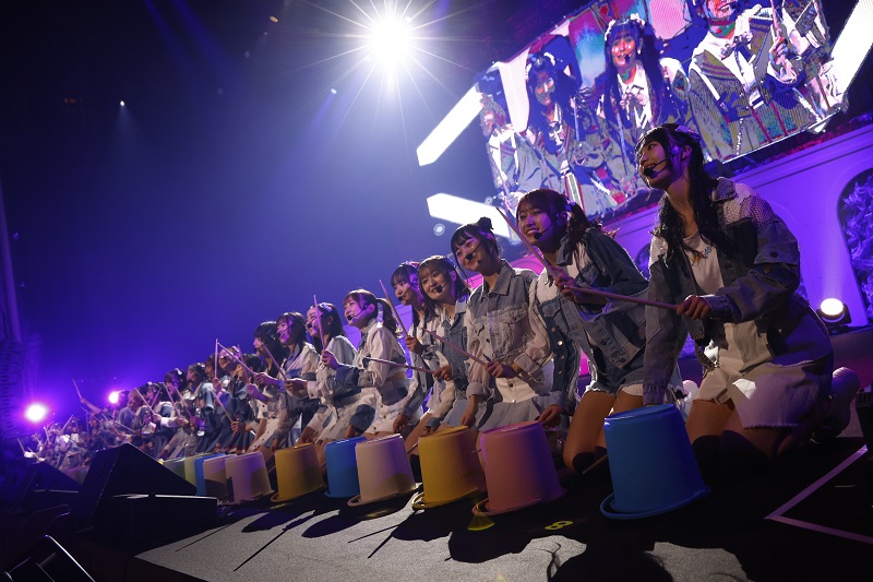 昼公演の1曲目は客席各所にメンバーが登場し、最新曲「バケツを被れ!」でスタート。初挑戦となるバケツを使った“ドラムスティックパフォーマンス”をメンバー全員で披露した。チームHキャプテンの豊永阿紀は「今日は心弾む、笑顔満開のコンサートにしましょう!」と呼びかけ、さまざまな組み合わせでのユニット曲や、春にちなんだ楽曲をパフォーマンス。
