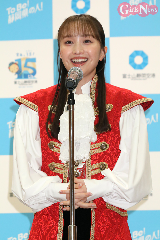 百田さんはハムレットをイメージしたCMのテレビCMの衣装で登場。出野勉 静岡県副知事からPR大使の委嘱状を受け取ると、「地元の静岡のPRをできて、とても嬉しい。しっかりと富士山静岡空港の魅力をお伝えし、たくさんの方に利用していただけるよう努めてまいります」と挨拶。