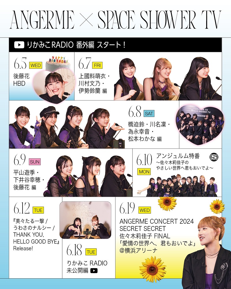 また、アンジュルム公式YouTubeチャンネルでは放送に先駆け、6/7(金)より「りかみこRADIO番外編」を公開。番外編では佐々木莉佳子と各メンバーが制限時間3分間で想いを伝える、一発撮りの2ショットトークを展開。果たしてどんなトークが繰り広げられるのか、番組本編と合わせて注目。