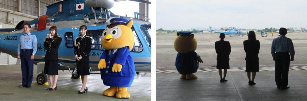 最後に、県警ヘリコプター「あかつき」が、式典出席者に見送られながら離陸し、空から特殊詐欺被害防止メッセージを届け、県民に注意喚起を行った。