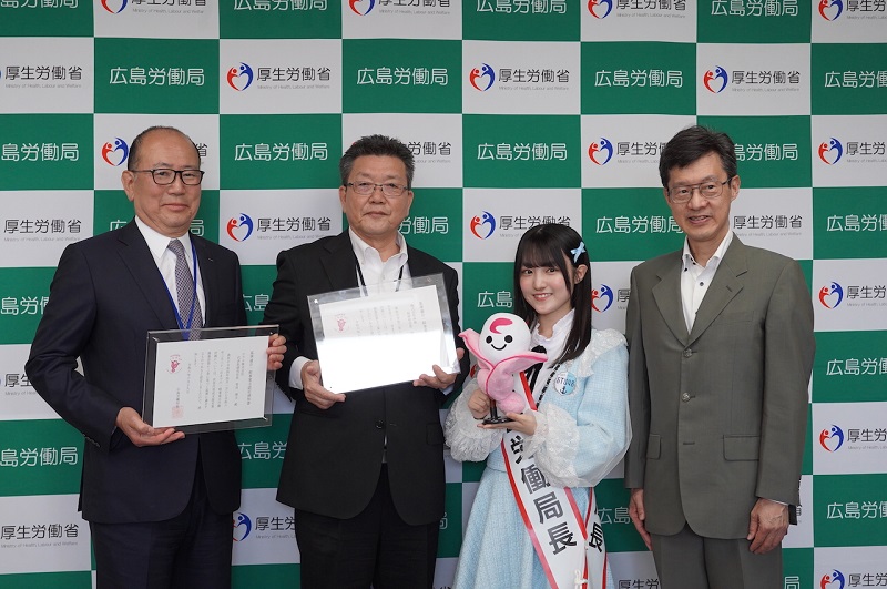 辞令交付後は 1 日広島労働局長として、厚生労働省が認定する、仕事と子育ての両立のための組織目標を達成するととも に、一定水準以上の男性の育児休業取得率や、法定を超える時間外・休日労働の時間を一定水準以下とするなど、すべての 認定基準を満たされた企業、次世代育成支援対策推進法に基づき認定された企業を「くるみん企業」として認定し通知する「く るみん認定通知書交付式」に出席し、株式会社外林(福山市 菓子卸売業) 取締役会長 浦上和明氏とテラル株式会社 (機 械製造販売業)代表取締役 菅田博文氏に「くるみん認定通知書」を交付した。