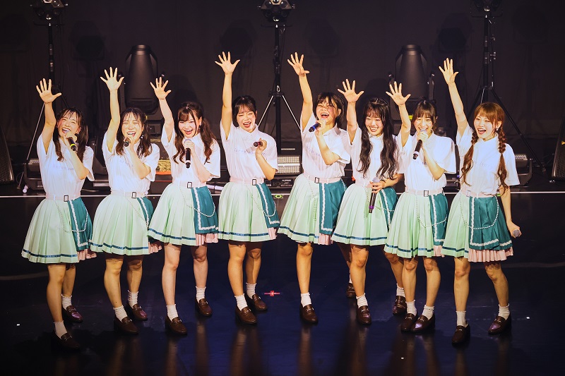 ファイナル公演はツアータイトルにもなった4⽉配信の「遠キョリ。だって本気」で幕が上がり、さわやかなグリーンの濃淡に彩られた⾐装で8⼈のパフォーマンスで、Zepp Shinjukuのホールはハッピーオーラに包まれた。続いて、波左間美晴があざとく「みはるんビーム」を⾶ばして2曲⽬「同担☆拒否」が始まり、客席へキュートなオーラを振りまいた。