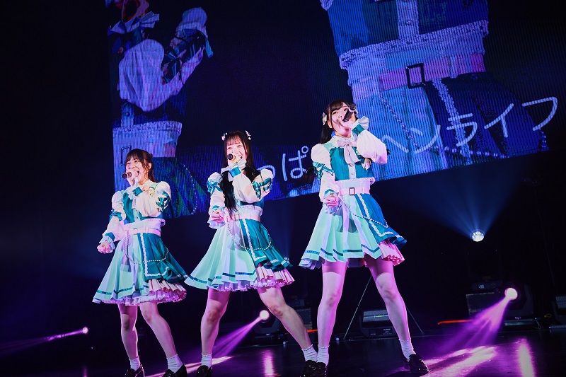 休むことなくユニット曲のパートに突⼊し、永尾と⼩⽥桐ななさの“Escape i DOL”はクールに決めた「SSS」、波左間・⾼澤百合愛・柴咲あかりの“ふわふわキャンディ”はキュートな「メルヘンライフ」、寺本・⼟屋玲実・福⽥ひなたの“⽩いスニーカー”によるアッパーな「ネバギブ!」と、メンバーの個性にあった3曲が披露され、特に「ネバギブ!」ではギターの重低⾳にのせての「やれんのか!」の煽りがフロアを揺さぶった。