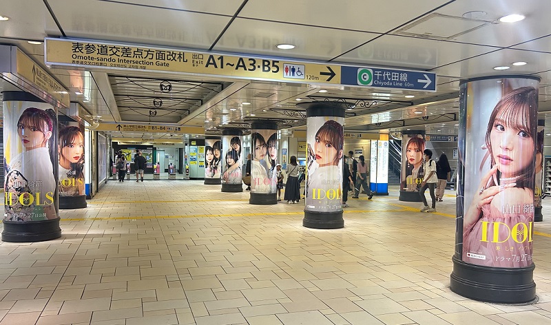 人気ガールズグループ・Girls²の山口綺羅、STU48の石田千穂、同じくSTU48の中村舞、HKT48の竹本くるみ、さらにはコレオグラファーとして参加している元HKT48の本村碧唯による、グループの垣根を超えたプロジェクト「IDOLS」の第3章として、ドラマ『IDOLS〜美しきインフェルノ〜』が7月27日(土)から4週にわたりYouTubeで公開される。その告知の柱巻広告が東京メトロ表参道駅に22日から28日まで展開されている。