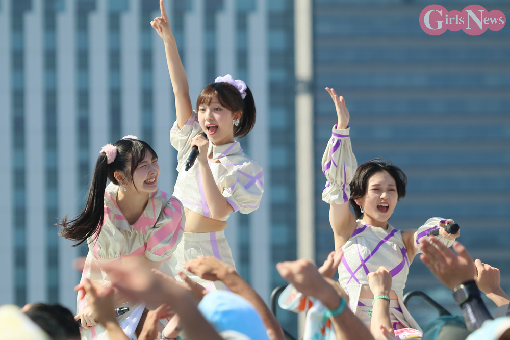 炎天下の青空の下、『灰toダイヤモンド』 『フックの法則』 『恋する銀河』の3曲を披露。メンバーの平井美葉は6月27日の公演中に左足首を捻挫しており、歌唱のみの参加となったが、ファンからの声援に笑顔で応えていた。