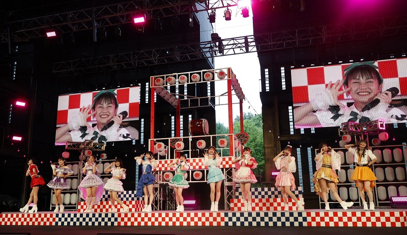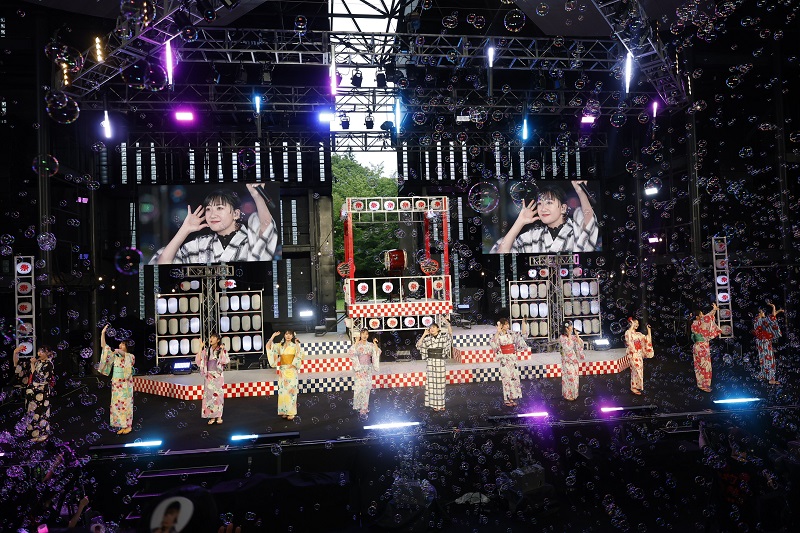 アンコールはメンバーが浴衣姿で登場。1 曲目は振り付けを盆踊りバージョンにアレンジした『アイドル天職音頭』。来場者と一緒に踊ることができるよう、事前に盆踊りの振付映像がYouTube で公開されており、ファンも一緒になって踊る姿が印象的だった。