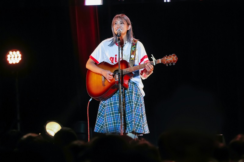 続いて、ステージにはアコースティックギターを肩からかけた岸本が登場した。スタンドマイクの前に立ち、自身の楽曲「なぐさめないで」を披露。壇上で「6 年弱ぶりの研修生発表会。2012 年頃からここで育ってきた身ですけども、大事なステージを借りられていることがうれしく思います」と感謝し、作詞曲「イチ、ミマン」ではアコースティックな空気感の中、ギターの音色と共に、そっと語りかけるような歌声を響かせた。