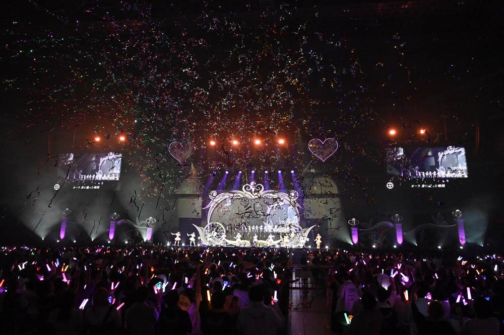 オープニングでおなじみの「Overture」が鳴り響いたのち、かぼちゃの馬車を模したステージ上の巨大なスクリーンが縦に割れ、魔法少女をイメージさせる鮮やかな衣装に身を包んだ=LOVEが姿を現す。彼女たちは“推し”の幸せを願いながらも「永遠にアイドルでいてほしい」と思うファンの強い愛情を歌った「絶対アイドル辞めないで」を1曲目に披露。「絶対アイドル辞めないで」はインパクトの強いタイトルと歌詞が様々なアイドルグループやアーティストのファンからも注目を浴び、音楽ストリーミングサービスでの累計再生回数が1,300万回、TikTokでの楽曲再生数が1.3億回を突破している話題曲だ。観客のテンションが急上昇する中、続いてメンバーはアリーナにのびる花道、その先に設置されたセンターステージへ。より客席に近い位置から弾けるような笑顔とともに歌とダンスを届けた。