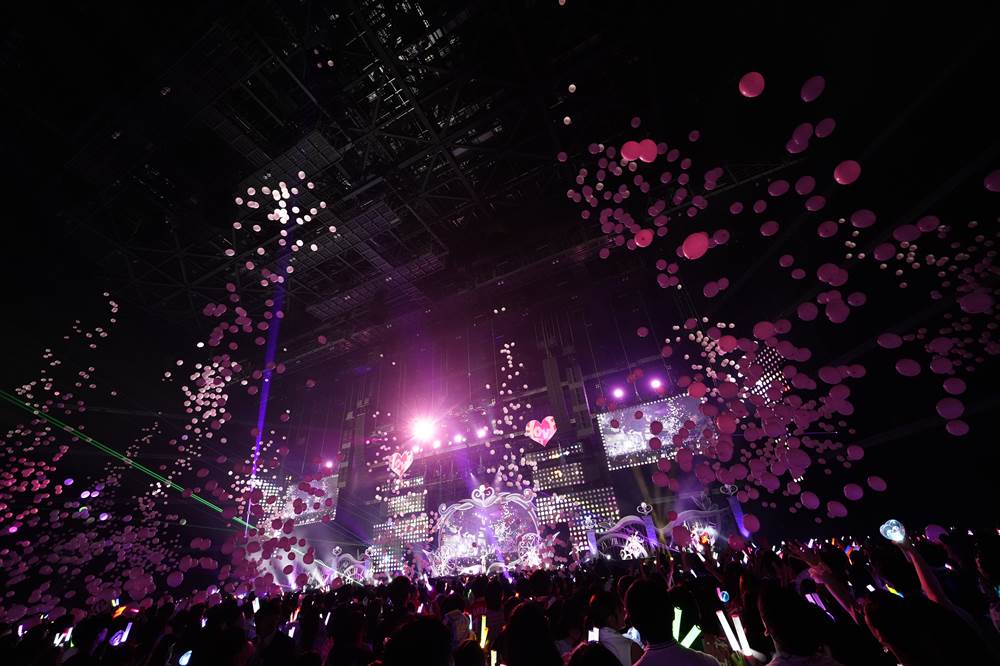 さらに=LOVEは、ユニット曲である「わたし、魔法使い」をメンバー全員で歌唱。彼女たちが衣装と楽曲の世界観にマッチしたハート型のペンライトを手に歌っている最中、ステージの前方からカラフルな銀テープが勢いよく何発も放たれ、会場を鮮やかに彩った。幕間映像を挟み、ファンから人気の高い楽曲「しゅきぴ」が始まると、耳や尻尾が付いた衣装に着替え、猫に扮した=LOVEがステージに登場。そのかわいらしい姿に客席からひと際大きな歓声が沸き起こる。「Want you!Want you!」の終盤には、ピンク色の風船が大量に客席へ降り注ぐ大規模な演出が。会場が瞬く間にメルヘンで幻想的な空間に様変わりした。