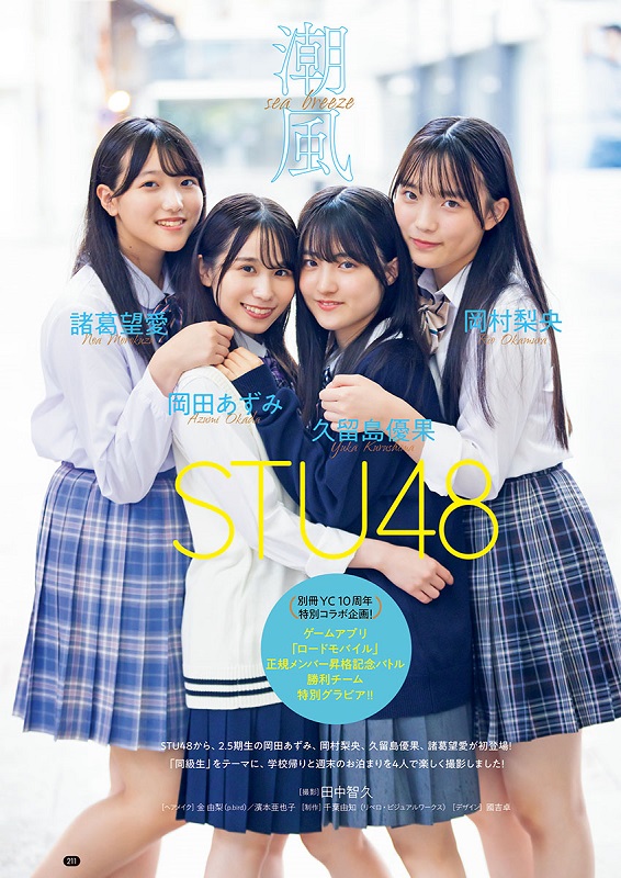 STU48の岡田あずみ、岡村梨央、久留島優果、諸葛望愛が、1日発売の雑誌「別冊ヤングチャンピオン」11月号(秋田書店)のグラビアに登場している。