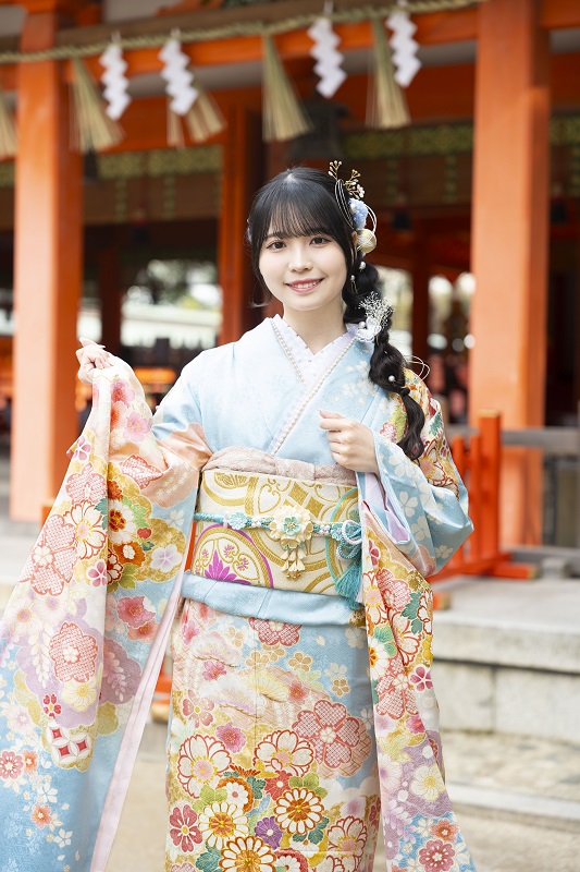 振袖は小さい頃から変わらず大好きな水色にしました。自分らしさを忘れず、自分らしさを更に自分の武器にしていき、元気と癒しを与えられる存在であり続けたいです。