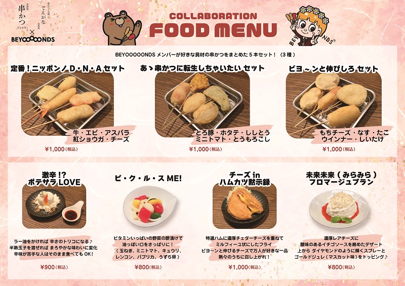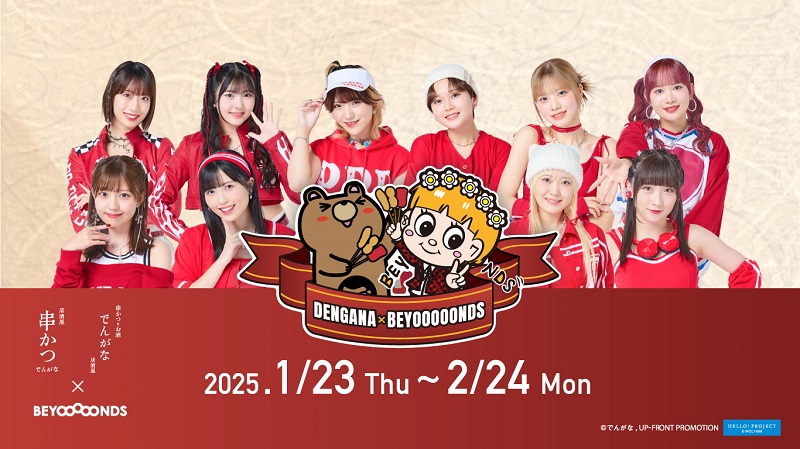 ハロー!プロジェクトのアイドルグループ・BEYOOOOONDSが新曲リリースを記念し、23日より串かつ居酒屋「串かつ でんがな」とネオ居酒屋「串かつとお酒 でんがな」とのコラボレーションを開始した。
