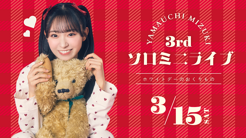 AKB48の中心メンバー・山内瑞葵がファンクラブ会員限定イベント『山内瑞葵 3rdソロミニライブ ホワイトデーのおくりもの』を3月15日(土)に開催する。3回目となるファンクラブイベントでは、ホワイトデーに合わせた特別な一日をファン届ける。