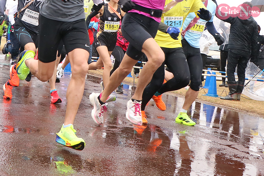 彩湖周辺の自然豊かな環境とフラットで走りやすいコースが魅力で、晴れた日には美しい景観を楽しみながら爽やかに疾走できるが、この日は朝から冷たい雨が降り、傘を飛ばすほどの強い風が吹く中での競技となった。常連の参加者からは「過去イチ過酷なレース」との言葉も漏れたが、観客の声援に背中を押されながら、次々と完走を決めた。