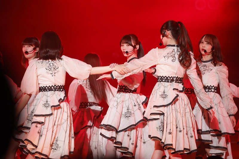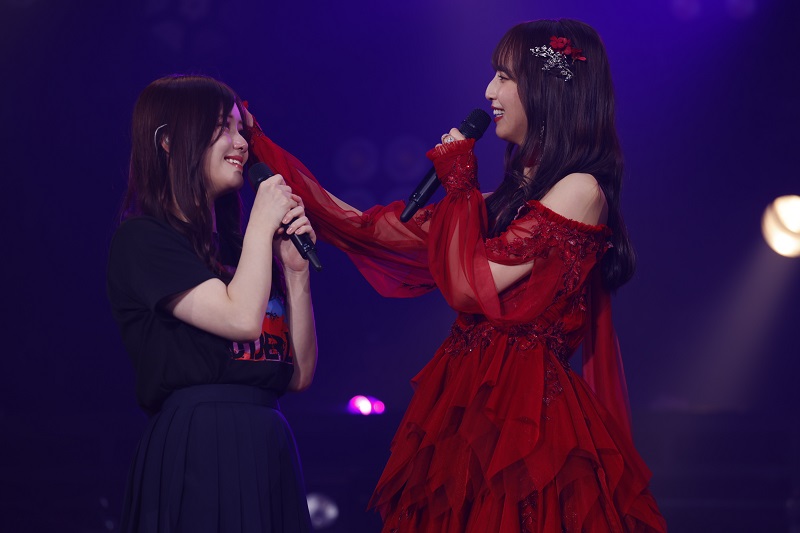 佐藤楓が敬愛する西野七瀬の卒業ソング『つづく』をソロで歌うと、同期の岩本、吉田と3人で『口約束』を歌った。『今、話したい誰かがいる』と『帰り道は遠回りしたくなる』を9人でパフォーマンスすると、東京での舞台を終えて駆けつけた伊藤理々杏が招き入れられた。