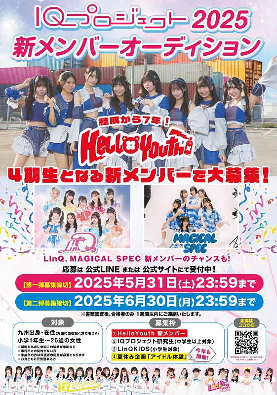 LinQなど九州を拠点に全国で活動するアイドルを擁する「IQプロジェクト」が「IQプロジェクト新メンバーオーディション2025」を開催することを発表した。今回は同プロジェクト所属、2018年に九州出身のメンバーで結成、結成7年を迎えるHelloYouthの4期生となる新メンバーを募集する。その他、14年の歴史で九州を代表するグループ・LinQ、結成5年目、東京での定期ライブも開催するMAGICAL SPECの新メンバーとしてデビューのチャンスもある。