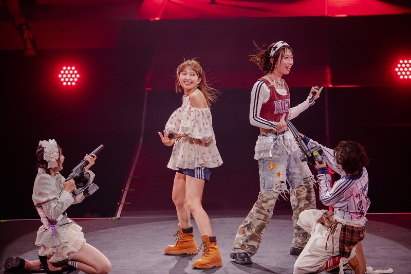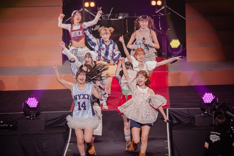 幕間の映像が終わると、平井と里吉が自ら考えたダンスで会場を熱くし、DJブースでは岡村と清野桃々姫がさらに客席のテンションを上げ、怒涛のパフォーマンスがスタート。繰り返すフレーズが癖になる「Do-Did-Done」から、お奉行様・高瀬と町娘・清野のやり取りがユニークな「恋愛奉行」、「涙のカスタネット」では客席とともにカスタネットで激しくビートを刻む。「フレフレ・エブリデイ」では会場がハッピーな雰囲気で満たされ、「Go Waist」では天井から現れたタオルを手にした江口紗耶の先導のもと、タオルを回しながら会場がひとつになっていく。