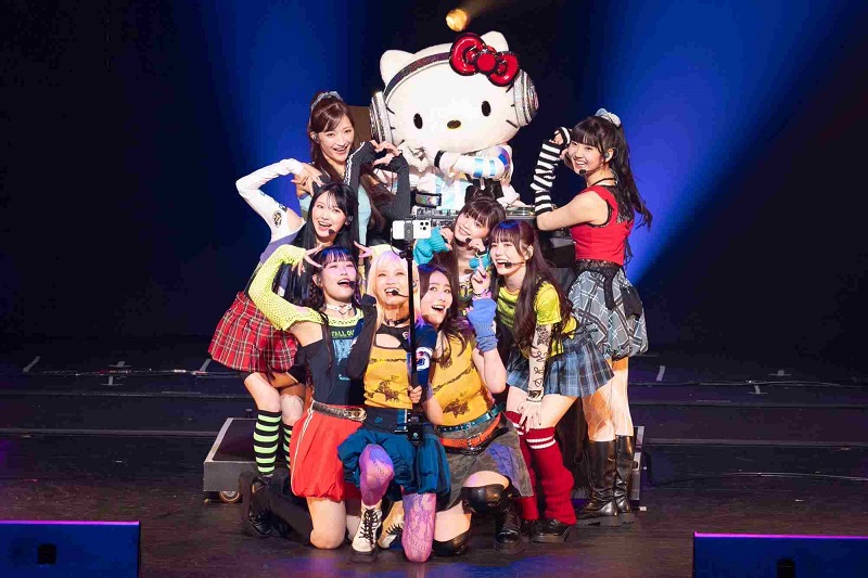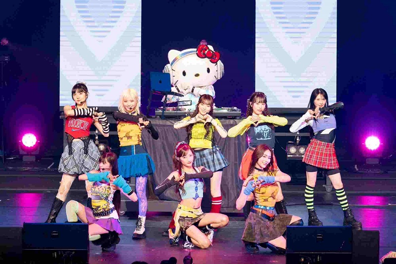 DJ MOMO(隅谷百花)とDJ TOA(原田都愛)によるDJ SHOWで会場をダンスフロアに変えると、なんとDJ Hello Kittyが登場。一緒に『HERE WE GO』『GIVE ME LOVE』をパフォーマンスし、よりキュートでかわいいステージを届けた。DJ Hello Kittyを送り出した後は、『スキップ!』をエモーショナルに届け、歌詞が映し出された『Flutter』では、切ない恋物語を語りかけるように歌い涙腺を刺激していく。ダンスパフォーマンスはもちろん、こういった楽曲を届ける歌唱力、表現力を磨き続けている彼女たちだからこそ、よりライブで深みを増していく。小田柚葉と隅谷百花が手を握り合いながら、目を合わせ、歌い上げていく感動的なシーンに心が震える。