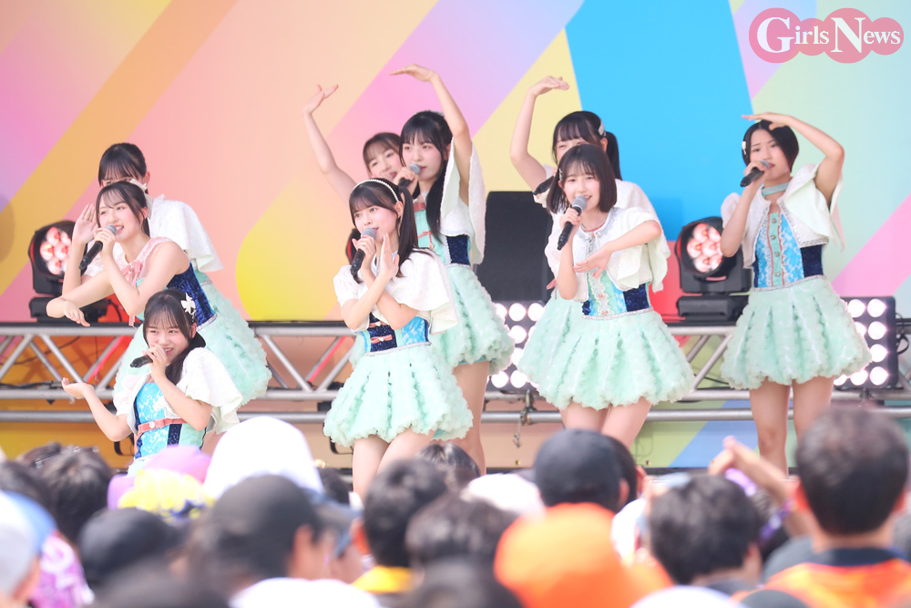 TIF最終日、HOT STAGEのトップバッターとして、メンバー9人がステージに姿を現した。開演を待ちわびた観客の熱気が渦巻く中、ライブは『夏のイナズマ』で勢いよくスタート。続けて松浦亜弥のカバー曲『GOOD BYE夏男』を投下し、会場の熱気を一気に引き上げた。