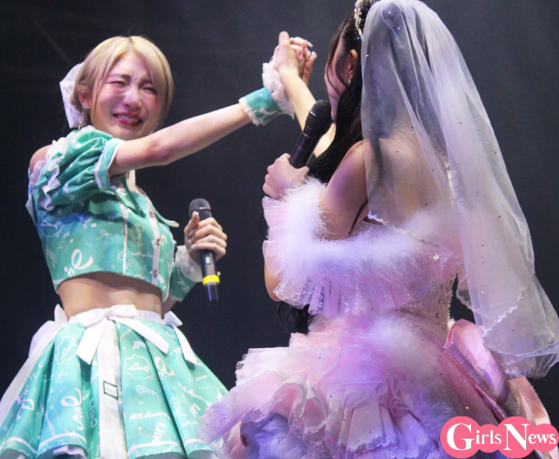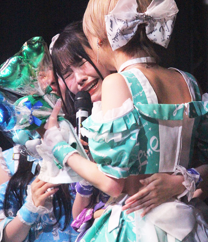 歌い終えた髙木さんのとなりには海月らなさんが。髙木さんは「らなは(卒業発表後の)この10ヶ月間、ほぼ毎日泣いていました。その涙を忘れません、ありがとうね」と語りかけると、海月さんの目からはぽろぽろと涙がこぼれる。そして全メンバーが再登場し、『キミがいたから』を歌唱。エモーショナルなムードの中、メンバーの歌声が次第に涙交じりになってくる。ステージ中央で全員が円になって肩を組み合い、『Shining Star』へ。タオルを回しながらの歌唱に、場内は大きな盛り上がりとなった。