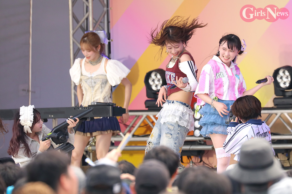最初のMCでは、高瀬くるみが「一番熱い時間に、この野外ステージに集まってくれたみなさん、こんにちはー!」と挨拶。炎天下の観客を気遣い、平井美葉も「ちゃんと水分補給してください、ここでね」と呼びかけた。