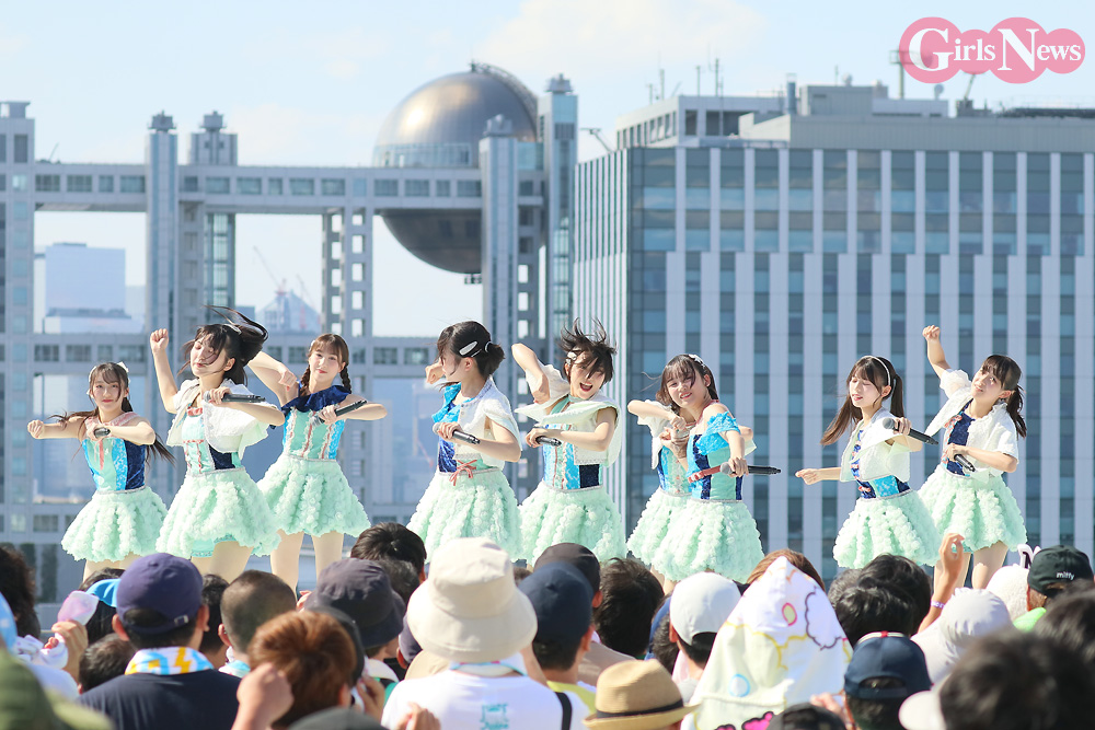 ステージからの眺めにも感動した様子で、橋田が「『夏のイナズマ』の間奏で、後ろを振り向くフリ付けがあったんですけど、めっちゃ景色綺麗だったの!」と興奮気味に話すと、他のメンバーも「こんな高いところでやることってないじゃん」と同意。橋田は「やっほー!ユニコーンガンダム!」と叫び、会場を和ませた。