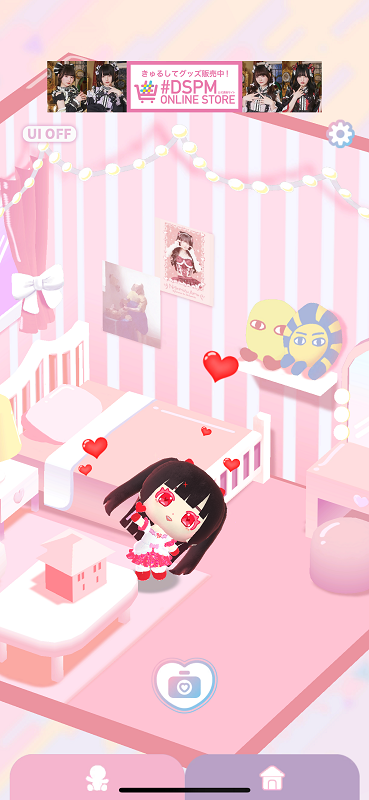 またカメラでぬいぐるみの姿を撮影するだけでなく、ホーム画面でぬいぐるみと触れ合える。ホーム画面は各メンバーをイメージしたお部屋になっていて、その中でぬいぐるみたちは自由に生活している。ぬいぐるみをタップすると可愛いリアクションも返してくれる。