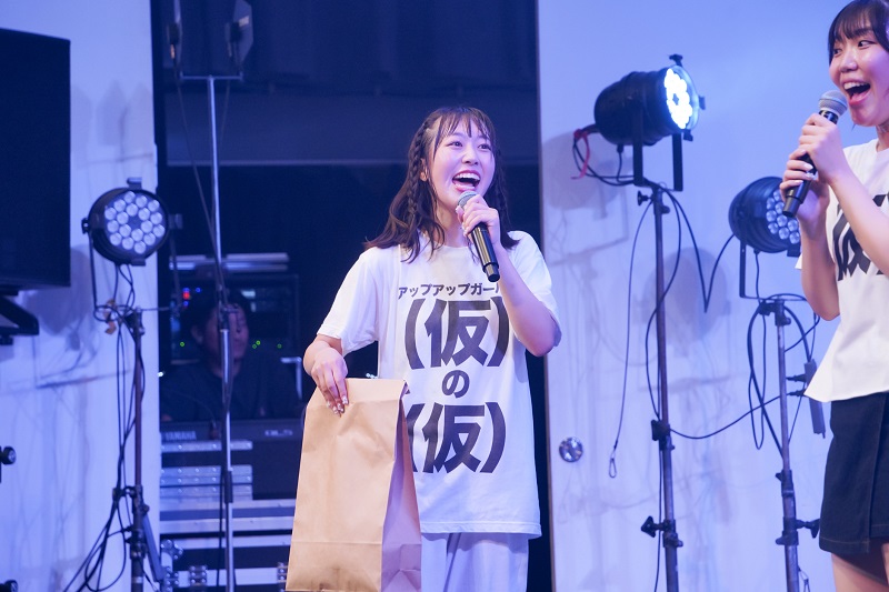 MCタイムで自己紹介したメンバーは、熱い夏を振り返るように夏曲ゾーンを展開する。話を遡ると、ワンマンの2週間前、彼女たちには所属するYU-Mエンターテインメントの山田社長から、この公演に向けた試練としてアプガ(仮)の(仮)のTシャツとタオルを完売というミッションが出されていた。そのミッションはライブ直前にギリギリクリア。メンバー3人と観客は「アップアップタイフーン」に乗ってアプガ(仮)の(仮)タオルを振り回し強烈に盛り上がる。爽やかなメロディが気持ちいい「メチャキュン♡サマー( ´ ▽ ` )ノ」のあとには、ラテンフレイバーの「サマービーム!」が投下され、メンバーと観客は“ラララ〜”の大合唱を巻き起こした。