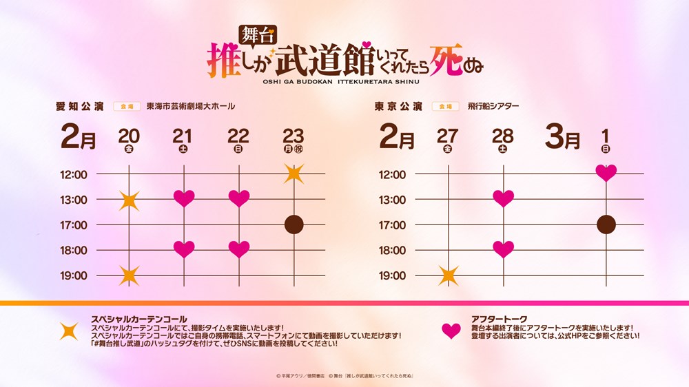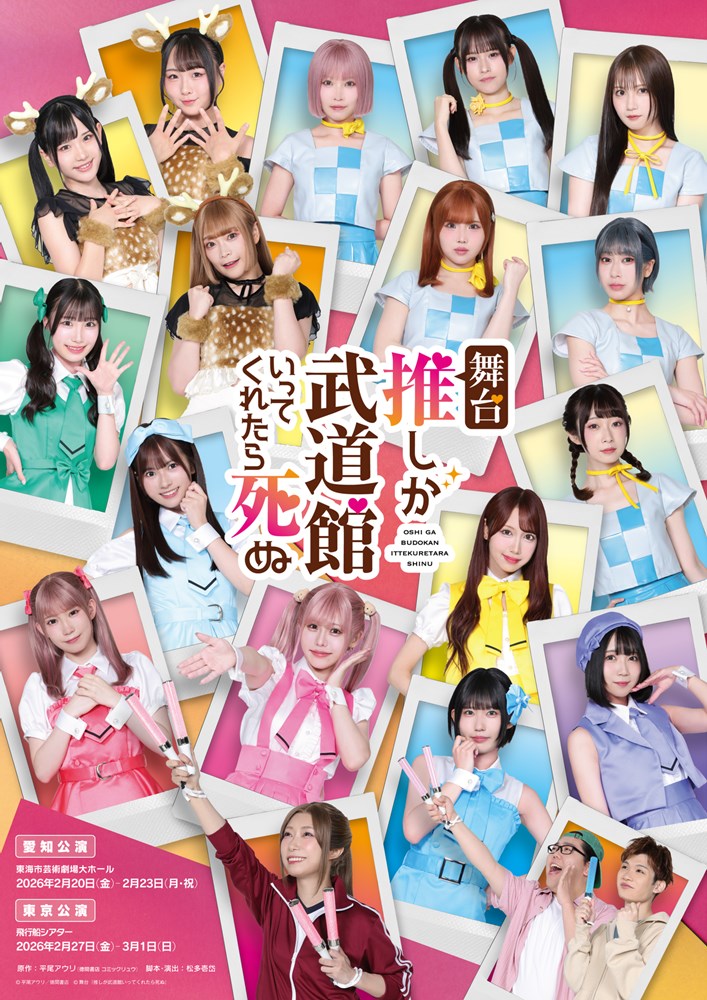 舞台『推しが武道館いってくれたら死ぬ』は、愛知公演が2026年2月20日から23日まで東海市芸術劇場大ホールで、東京公演が2月27日から3月1日まで飛行船シアターで行われる。チケットの最速先行が現在実施中。