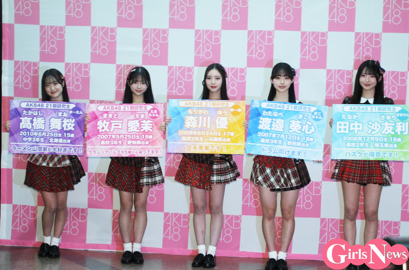 取材会には21期研究⽣の髙橋舞桜、⽥中沙友利、牧⼾愛茉、森川優、渡邉葵⼼の5人がやや緊張の表情を見せながら取材陣の前に立った。北海道出⾝の中学3年⽣(15歳)の髙橋さんは「ラーメン⼭岡家が⼤好きです」、愛知県出⾝の⾼校3年⽣(18歳)の牧⼾さんは「クラシックバレエを5歳から習っていることです」、兵庫県出⾝の⾼校2年⽣(17歳)の森川さんは「空⼿⿊帯を持っていることと、韓国語が喋れます」、秋⽥県出⾝の⾼校3年⽣(18歳)の渡邉さんは「特技はドラムが叩けることです」埼⽟県出⾝の⾼校2年⽣(16歳)の⽥中さんは「バスケが得意なところです」と、それぞれ自分の特技や趣味を初々しく伝えた。