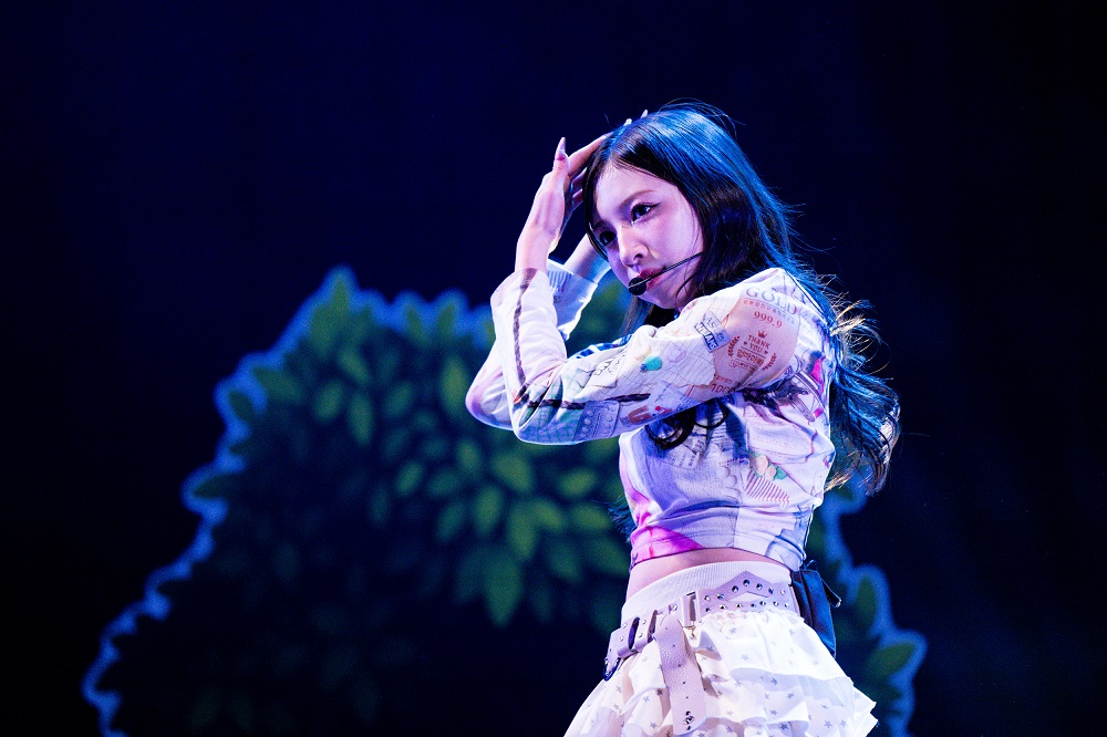 その後、同じくTaku氏プロデュースの『F.A.F.O』へ。会場のボルテージはさらに高まる。そして今年発売し話題になった『KAWAII KAIWAI』、その中国語版『KAWAII KAIWAI -Chinese Ver.”喵喵心跳”-』を初披露した。ファンにはすっかりおなじみの同曲ではあるが、歌詞が日本語版の直訳ではなく、中国のモバイルゲーム『ストリノヴァ』テーマソングということで、その世界観に合わせた内容となっている。このゲームのアンバサダーも4人が務めており、MCでは中国語の発音に苦労したエピソードを明かしたほか、ゲームで自身が担当したキャラクターについて紹介した。