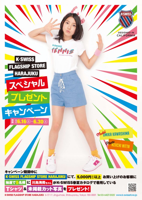 K-SWISSでは原宿キャットストリートポスタージャックキャンペーンを展開する。6月16日(土)から6月30日(土)までのポスター掲出期間中に原宿フラッグシップストアにて5,000円以上のお買いものをすると、抽選で5名様に川島海荷さんがカタログで着用しているTシャツとカタログ未掲載カット写真がプレゼントされる。