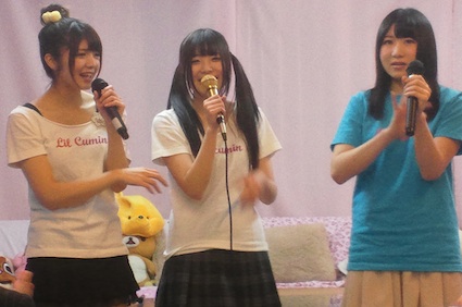 メンバー登場し、リル・クミン恒例のゆるゆるトークからスタート。今日の主役ゆうゆう(矢野悠来)はツインテール。みかぽん(野口みか)はおだんごヘアがゆうゆうに好評でした。りちゃあ(青柳理沙)はなぜかTシャツにマフラーという寒いのか暑いのかよくわからないかっこうをツッコまれてました(笑)。