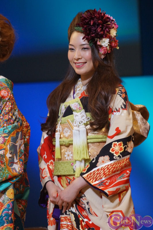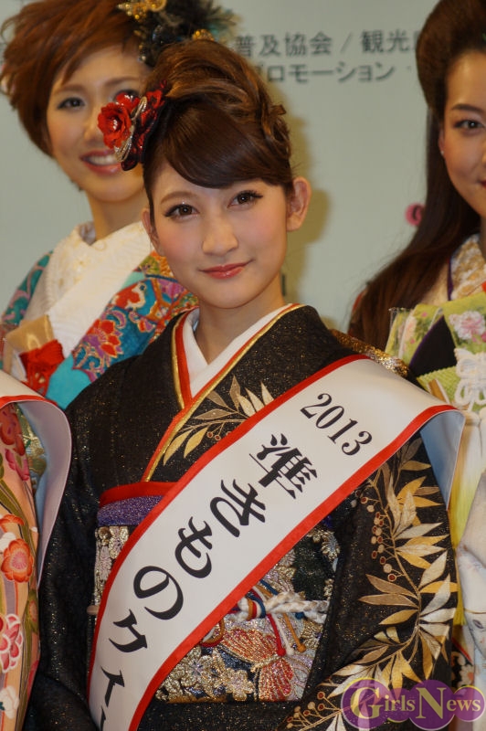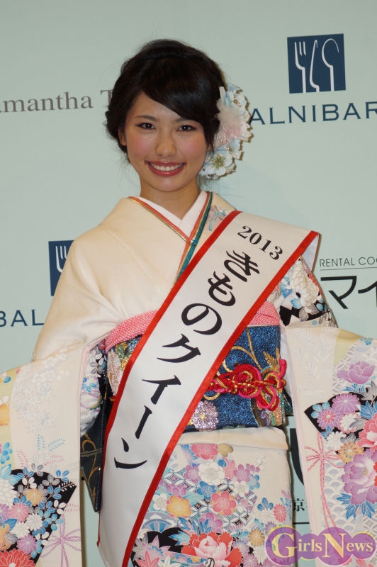きものクイーン2013に選ばれた臼井千晶さんは「実感がすごいわからないんですけど、今までに無いドキドキや女性らしさを意識をしたのは良かったなと思いますし、それも(審査員の方に)伝わってたのもすごい嬉しかったです。」とニッコリ。