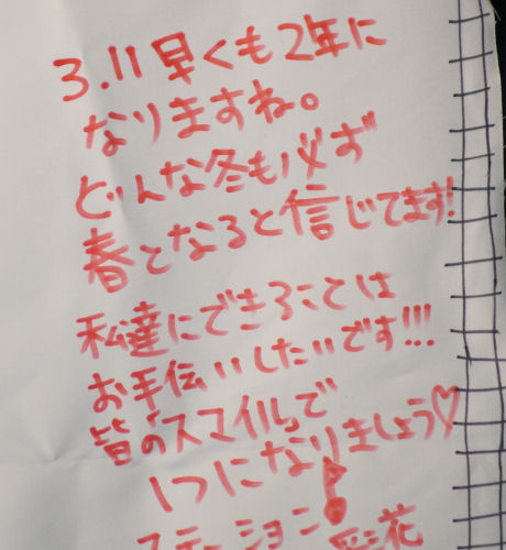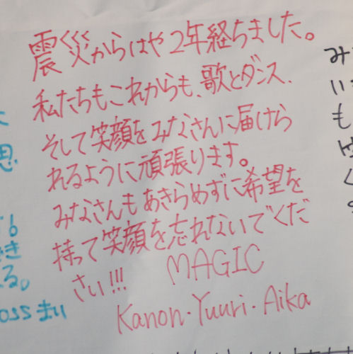 SCK GIRLSのリセさんは「私にとって心の絆創膏になる歌は愛じゃないかなって思います。私たちは本当にたくさんの方々に、被災地をなんとかしたいという愛をいただいていて、そして、その愛を返せるようにと活動をしてるんですけども、被災地で本当に悲しくなった時にもたくさん愛が溢れた歌を聞いて励まされてきました。その愛の歌を次は私たちが落ち込んでいる人たちに歌っていけたらなと思います。」と語った。