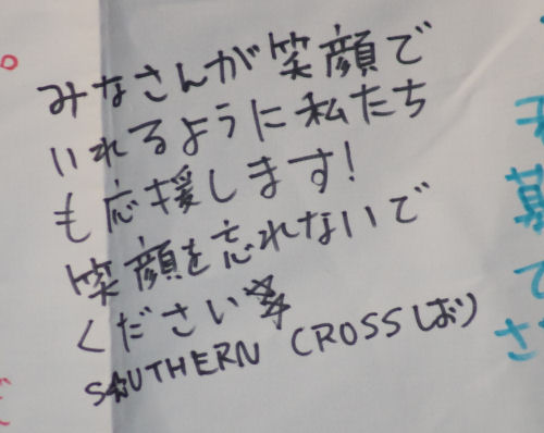 SCK GIRLSとS★UTHERN CROSSのメンバーが、3月11日に気仙沼市役所を訪問し、復興応援のメッセージが寄せられた応援フラッグと義援金を届ける。