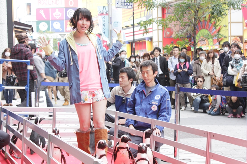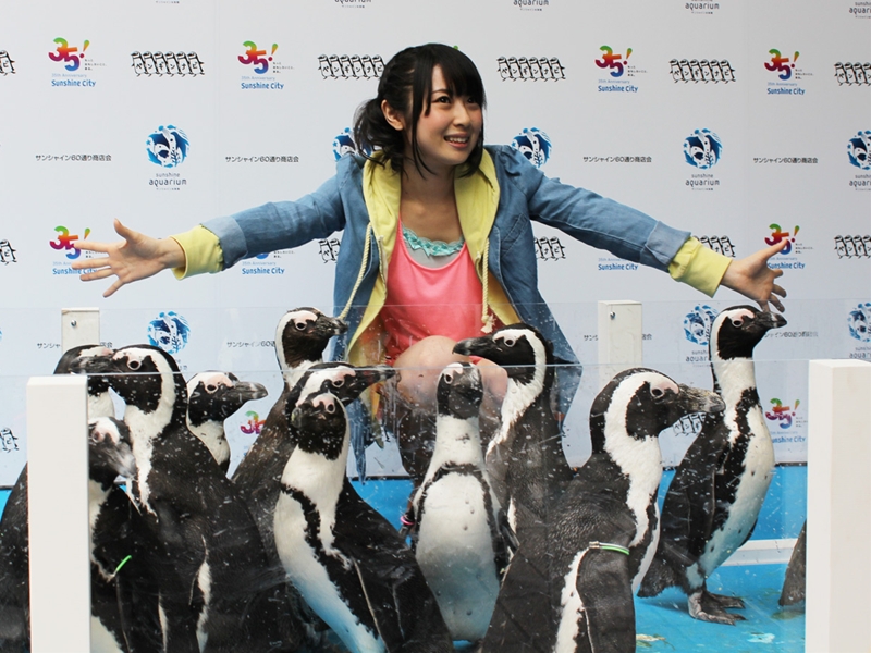 AKB48の姉妹グループで名古屋・栄を本拠地に活動するSKE48の高柳明音(21)が、東京・池袋(東京都豊島区)の商業施設サンシャインシティで行われたARアプリ「ペンギンナビ」のPRイベントに出演し、会場に設置されたペンギン仕様のレッドカーペットを10羽のケープペンギンと一緒に歩いた。