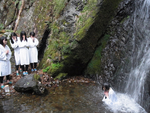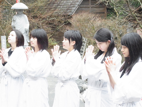 お寺では作法の心得とお経の念仏を学び、腹式呼吸の鍛錬も実施。繰り返される大声での念仏修行に続いて、お百度参りにもトライ。小雨が断続的に降り続ける中、ひたすら念仏を唱えながら裸足で境内を往復する修行は、駆け足で一時間にも及んだ。続く滝行では、3月下旬ながら10℃を下回る気温の中、冷たい滝の水に打たれつつ極限の精神集中を試されたベイビーレイズ。自らを追い込むことで、来たるCD発売日、定期ライブ、そしてあやまんJAPANとの対戦に向けての気持ちを高めた。