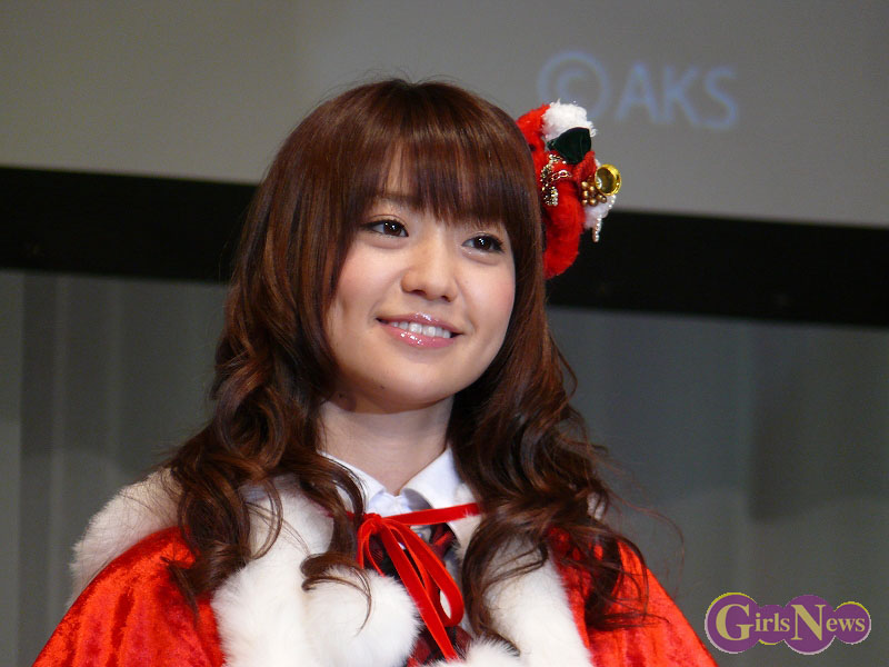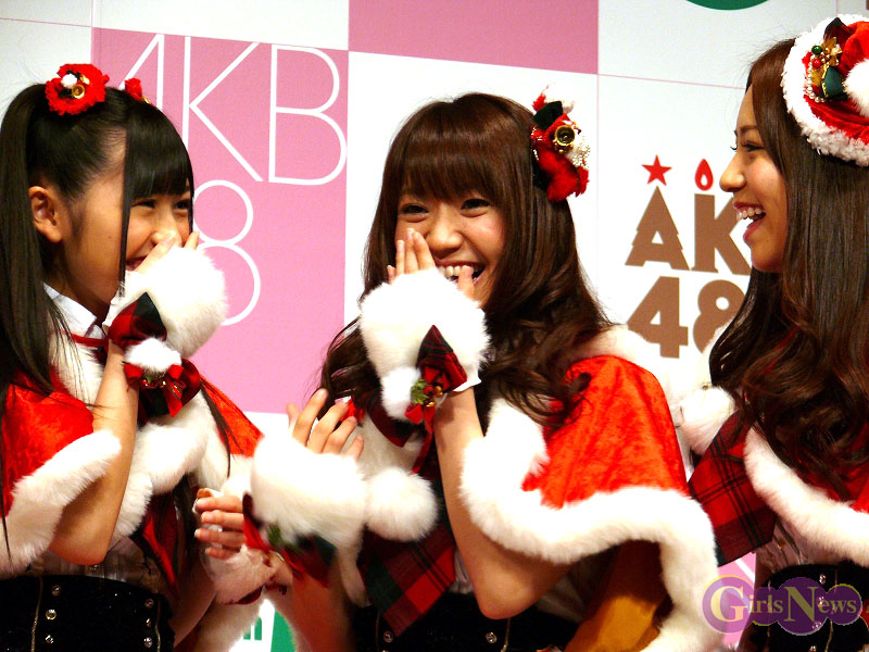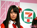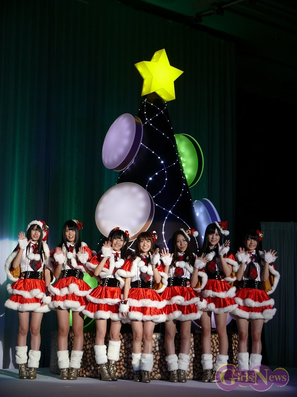 サンタの衣装で登場したのは、写真右より横山由衣さん、小森美果さん、河西智美さん、大島優子さん、渡辺麻友さん、前田亜美さん、森杏奈さん。最初にCMのメイキングが会場で上映され、セブンイレブンといえば?の質問に宮澤佐江さんが「肉まん!」そして。柏木由紀さんは「上京して初めて食べたのがセブンイレブンのおでんなのでおでんです」と答える場面もあった。メンバーが登壇し、AKB48のメンバーが意見を出し合って出来たという「マカロンケーキ」の紹介をした。巨大マカロンツリーケーキのお披露目でメンバーがケーキにライトを灯す点灯式も行なわれた。クリスマスの思い出を尋ねられ、河西さんは「クリスマスにPVの撮影があったのが記憶にあって、遠くまで車で行って旅館でメンバーで一緒にクリスマスを迎えたんです。星がすごく綺麗でした」と答えた。理想のクリスマスを尋ねられ、大島さんは「イルミネーションよりも自然の星の光がいいですね」と回答。渡辺さんは「やはりクリスマスケーキで家でのんびりがいいです」と答えた。前田亜美さんは「最近までサンタがいると思ってたんですけど」というと、メンバーから「いや、いるいる!います」という声があがった。また、今年の紅白は?の質問に大島さんは「一年の締めくくりですから出させていただきたい」と語った。