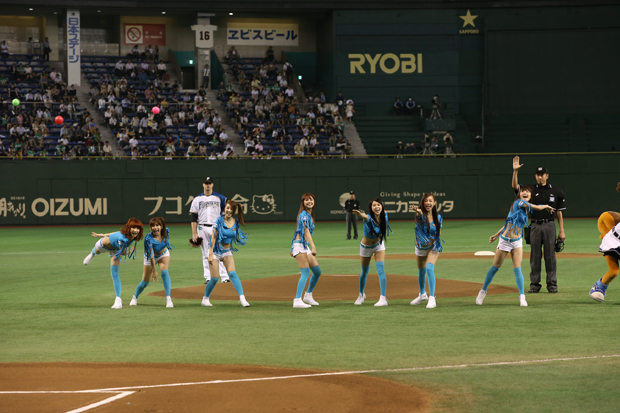 試合中は、陽岱鋼選手の出場するたびに、3rdシングル「恋のラブ?サンシャイン」がかかり、球場はさらにヒートアップ!試合も北海道日本ハムファイターズが逆転勝利を収め、見事ウェザーガールズは勝利の女神となりました。