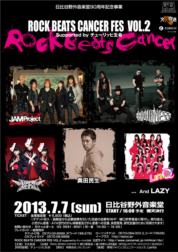 LOUDNESSドラマー樋口宗孝基金主催による小児がん患者支援・疾患啓発・研究支援のためのRock Charity Live vol.2が2013年7月7日 日比谷野外大音楽堂で行われる。