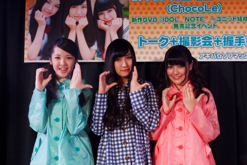 6月29日、アイドルユニット『ChocoLe』の橋本楓・高橋胡桃・玉川来夢の最新DVD「IDOL NOTE ~ユニット結成編 橋本楓~」「IDOL NOTE ~ユニット結成編 高橋胡桃~」「IDOL NOTE ~ユニット結成編 玉川来夢~」の発売を記念したイベントが、アキバ☆ソフマップ1号店にて開催された。