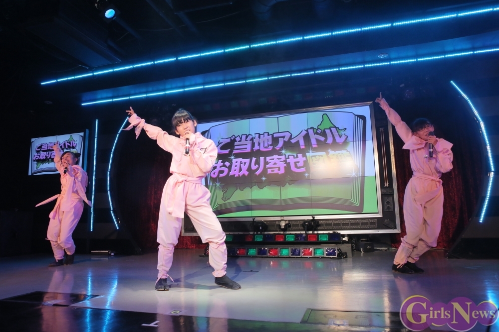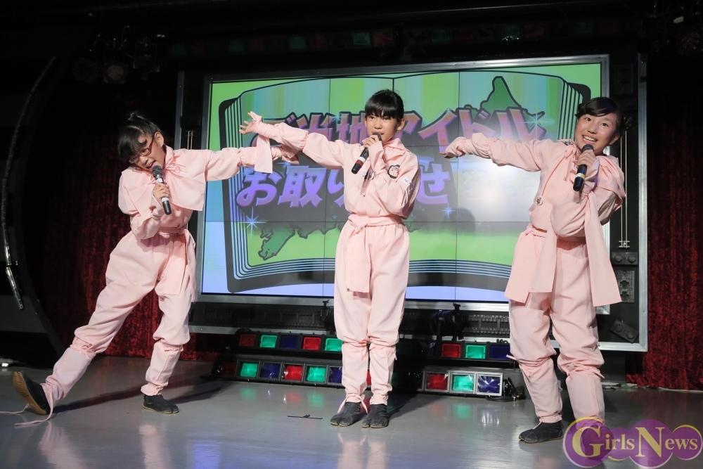 この日3組目の登場となったのは、兵庫県の姫路で活動をするHmj姫っ娘5。美南(みなみ)、咲希(さき)、華奈(かな)の小学生3人組ユニットで、姫路を盛り上げる!姫路から飛び出す!アイドルを掲げ、日々姫路のPRを行っている。「くノ一」として活動する彼女たちだが、歌や踊りなどの特技(忍術)を、色々なものに変装することでパフォーマンスしている。