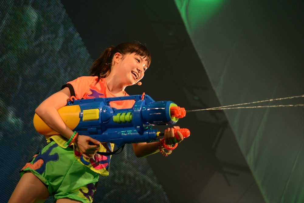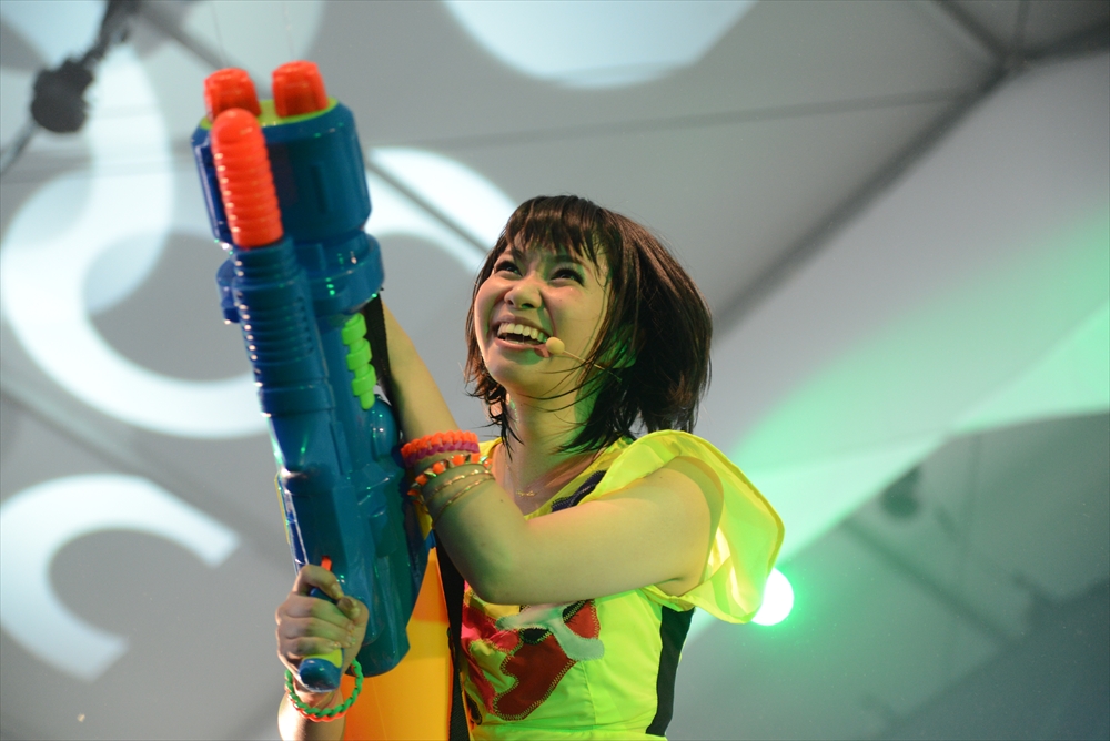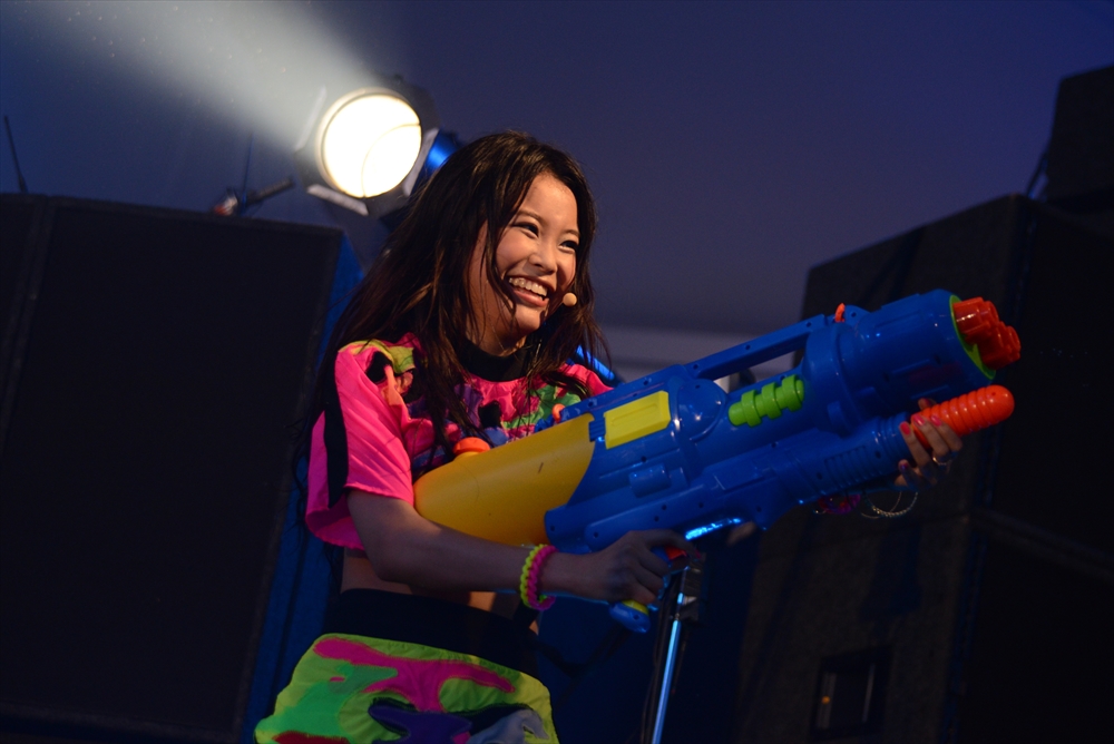 夏ソング「too blue」、観客も一緒になって踊る「One Kiss」の後、最後の「困惑コンフューズ」は、サビの部分で会場全体が一つになってタオルを振り回し、水鉄砲で観客に水を掛けるという夏フェスらしい光景も。会場のテント内の熱気は、外が涼しく感じられるほど暑く、大盛り上がりの中、アップな曲尽くしのセットリストで駆け抜けた。