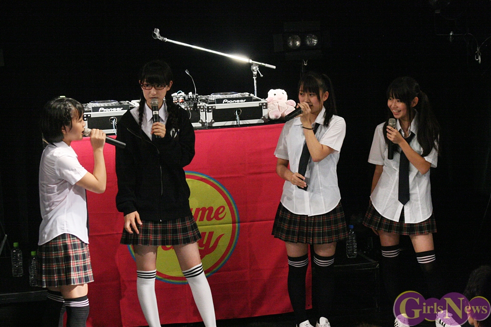 HIKARU:このたびは1stワンマンライブにお越しいただき、ありがとうございます。私はこんなに集まるなんて思ってなくて。こんなに成長できるなんて皆さんの応援のおかげだと思ってます。結成当時は、三つ編みにメガネが本当に嫌で。なんでやんなきゃいけないんだろうと思って。それでメンバーにも泣きながら相談したこともあったんですけども。でも今は本当にこれでやりがい感じているし(会場笑)、ライムベリーで良かったなと思っています。今はリリイベの最後としてワンマンやっていますけど、1回休止しちゃう、みんな泣いちゃう、ってこともあるけど、絶対1、2ヶ月後にはこの4人で帰ってきますから。皆さん安心して下さい。今日念願のお父さんが来たんですよ、このワンマンに。親にも感謝してますし、Pちゃん(ぶたのぬいぐるみ)も連れてきたし。Pちゃんは私が1歳の頃から持ってるぬいぐるみで、本当に大事にして…(MIRIが雑に扱う、会場笑)。おばあちゃんから貰ったもので、今まで本当に大事にしてて。一緒にステージに立ててることと、あとPVにもでてるんですよ。本当に嬉しくて、まさか自分も一緒に共演できると思わなくて。それで本当に、皆さんには感謝でいっぱいです。これからもライムベリーをよろしくお願いします。