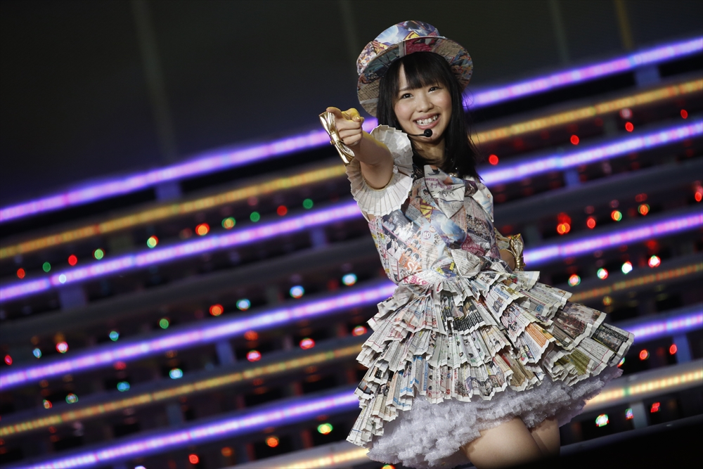 アンコール明け、衣装費用が1万円という低予算の為AKB48の記事で埋め尽くされた新聞で作られたというワンピースに身を包み、ひとりステージに登場した松村は「“かおたん”こと松村香織です!」と少し緊張の表情を浮かべながらも元気に挨拶。バスケ部の先輩に憧れる女の子の気持ちを歌ったブリブリのアイドルソング「マツムラブ!」を、指原がイメージを伝え完成した振りとともにパフォーマンスしました。
